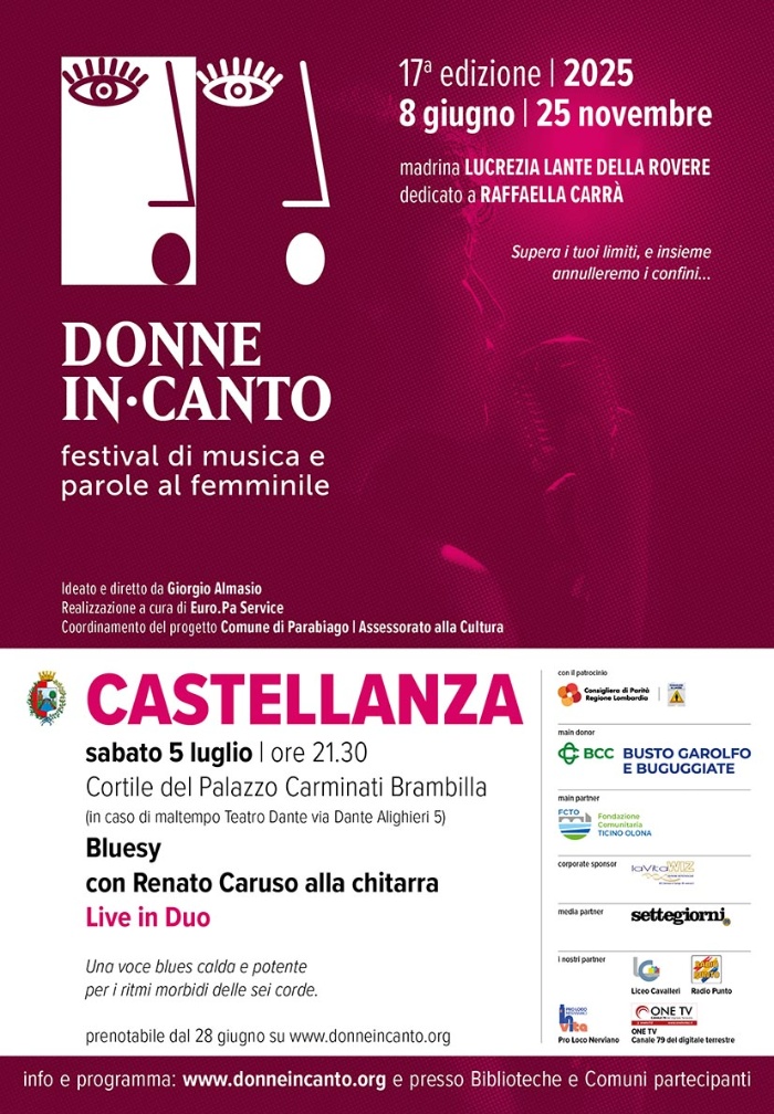 «Il Festival Donne In·Canto torna in città con il concerto di Bluesy e Renato Caruso -è il commento dell’assessore alla Cultura e all’Istruzione di Castellanza Davide Tarlazzi-. Con Giorgio Almasio, direttore artistico del Festival, si è scelto di proporre un incontro artistico originale e affascinante, pensato anche per coinvolgere il pubblico più giovane. La presenza di Bluesy, voce proveniente dal mondo dei talent, risponde a questo intento. Accanto a lei, l’esperienza e l’eleganza musicale di Renato Caruso contribuiranno a dare vita a una performance che ci farà apprezzare ancora una volta la bellezza della musica dal vivo di qualità».