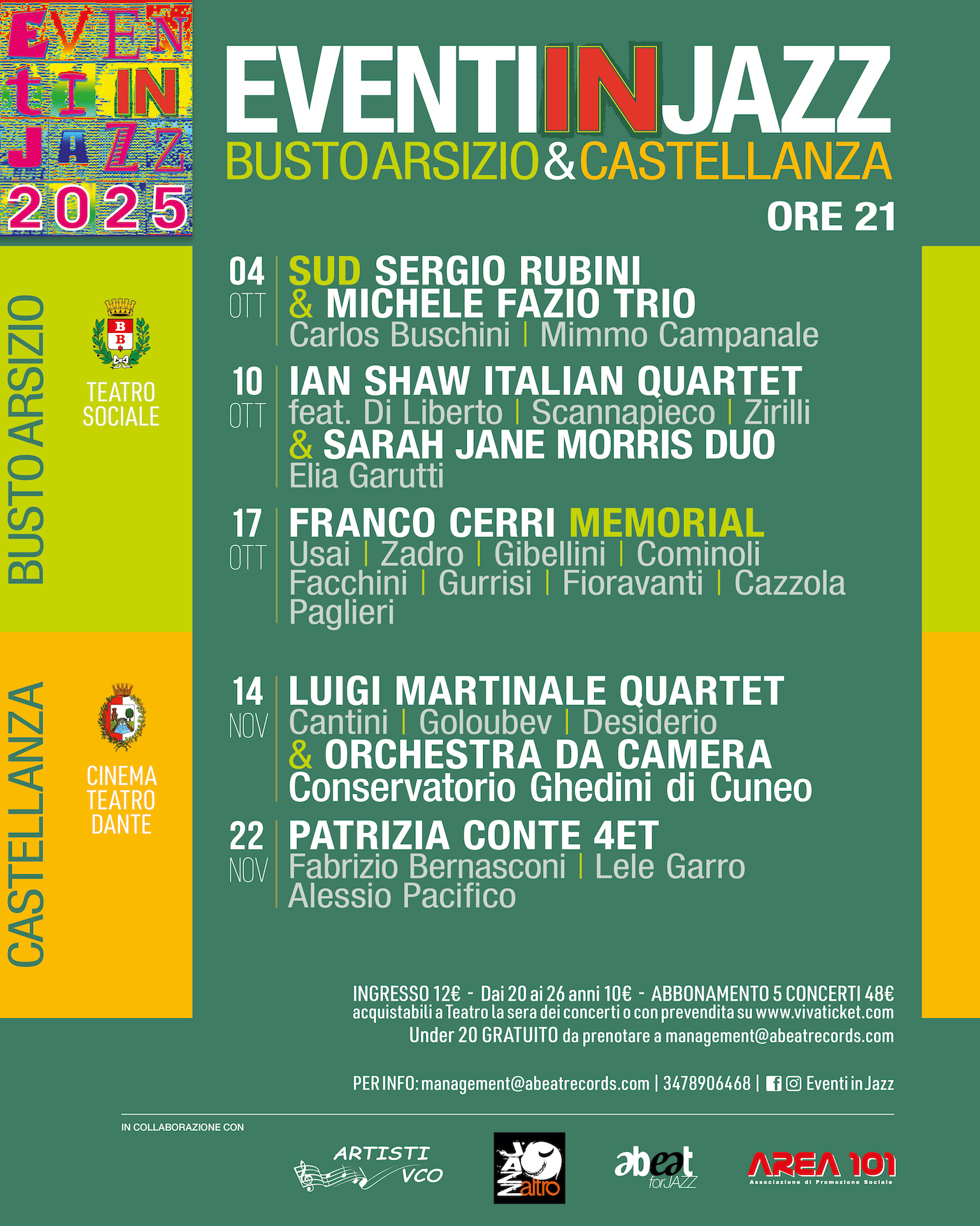 Dopo i concerti al Teatro Sociale di Busto Arsizio con Sergio Rubini e Michele Fazio, le voci internazionali di Ian Shaw e Sarah Jane Morris e il Memorial Franco Cerri, “Eventi In Jazz” approda a Castellanza per gli ultimi due appuntamenti della nuova edizione. La rassegna organizzata dall’associazione VCO con la direzione artistica di Mario Caccia porta al Cinema Teatro Dante due serate che rappresentano l’eccellenza del jazz italiano contemporaneo, unendo tradizione e sperimentazione, ricerca compositiva e interpretazione di alto livello.