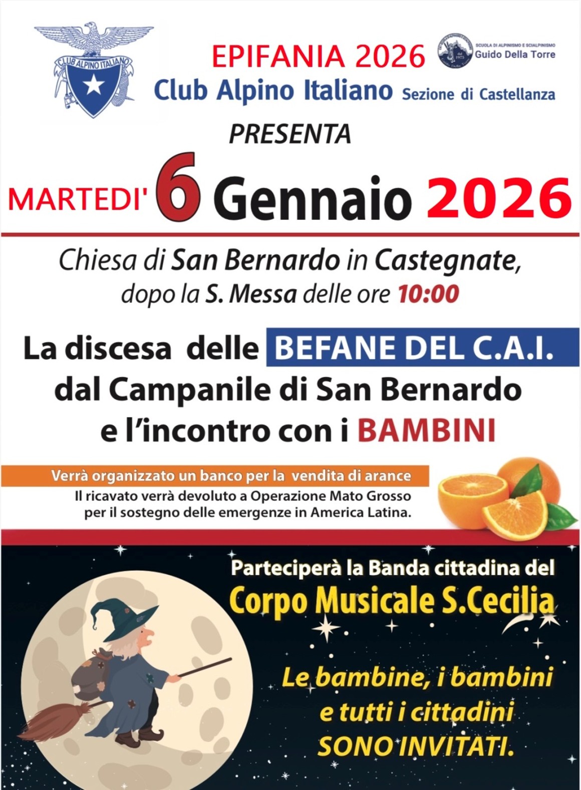 Il CAI di Castellanza, con il patrocinio del Comune, torna a celebrare il giorno dell’Epifania con il tradizionale evento che unisce i festeggiamenti e la solidarietà internazionale. Martedì 6 gennaio, al termine della Messa delle 10 alla chiesa di San Bernardo di Castegnate, le “Befane del CAI” scenderanno dal campanile per incontrare i bambini con tanti dolci e sorprese.