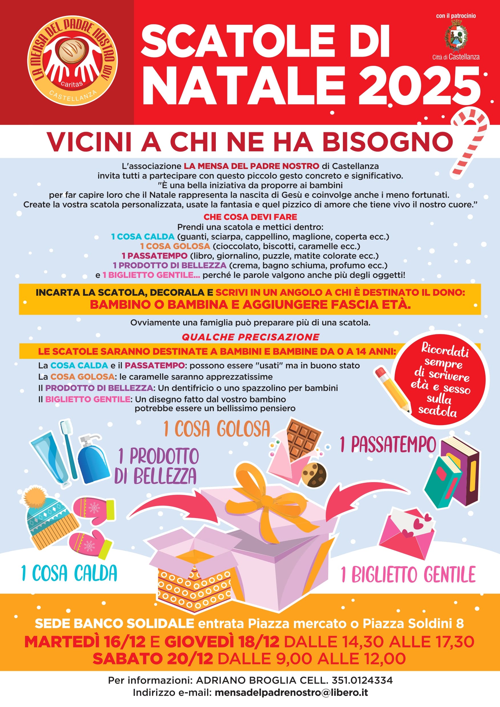 La raccolta delle scatole avverrà presso il banco solidale allestito in Piazza Mercato (entrata), in Piazza Soldini, secondo il seguente calendario: martedì 16 dicembre e giovedì 18 dicembre dalle 14,30 alle 17,30, sabato 20 dicembre dalle 9 alle 12. Ogni famiglia può preparare più di una scatola, contribuendo così a moltiplicare i gesti di vicinanza verso chi ne ha bisogno. Per ulteriori informazioni è possibile contattare Adriano Broglia al numero 351.0124334 o scrivere all’indirizzo email mensadelpadrenostro@libero.it.