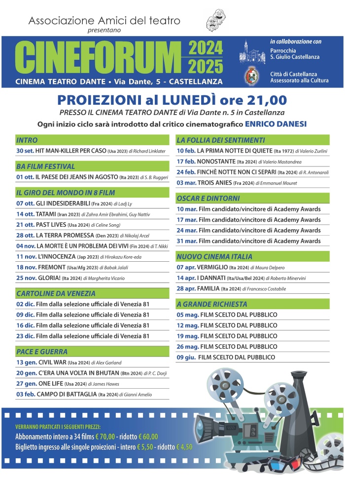 L’Associazione Amici del Teatro, in collaborazione con l’Amministrazione Comunale di Castellanza e la Parrocchia S. Giulio, propone il CINEFORUM 2024/2025.