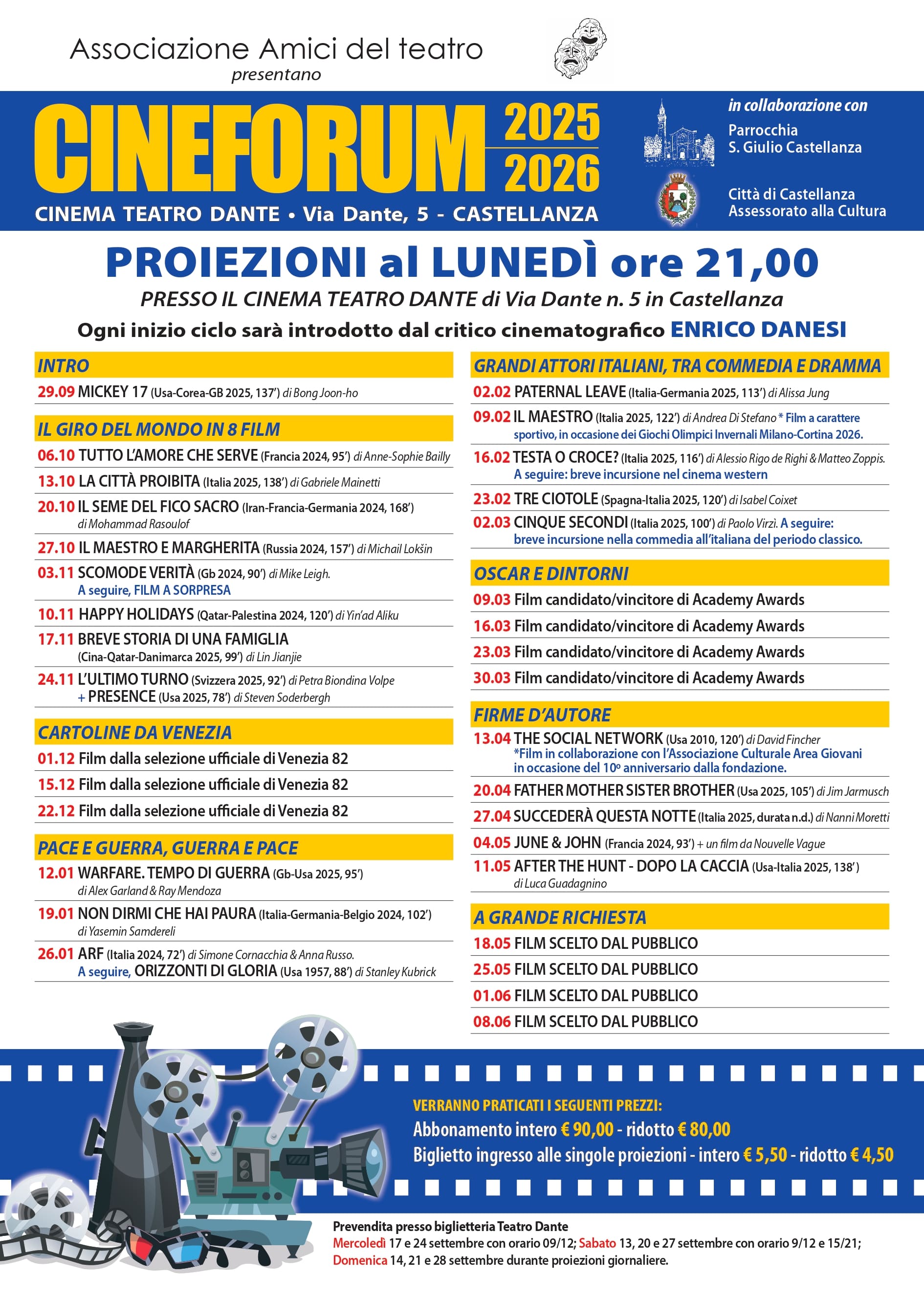 Fino all’8 giugno 2026, 33 film sono stati messi in calendario e saranno proiettati, come di consueto, al Cine Teatro Dante di via Dante a Castellanza ogni lunedì sera alle 21.