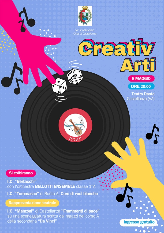 Il progetto CreativArti, nato dalla collaborazione tra tre Istituti Comprensivi della provincia di Varese, sbarca a Castellanza nella serata dell’8 maggio unendo musica, canto e teatro in un'unica manifestazione. Protagonisti della serata saranno gli studenti dell’Istituto "Manzoni" di Castellanza che presenteranno lo spettacolo teatrale “Frammenti di pace”, una sceneggiatura originale scritta dagli stessi ragazzi del corso A della scuola secondaria Leonardo Da Vinci. Accanto a loro, il “Bellotti Ensemble” dell'istituto Bertacchi di Busto Arsizio, composto dai giovani musicisti della classe 1A del percorso a indirizzo musicale, e il coro di voci bianche dell'istituto Tommaseo di Busto Arsizio.
