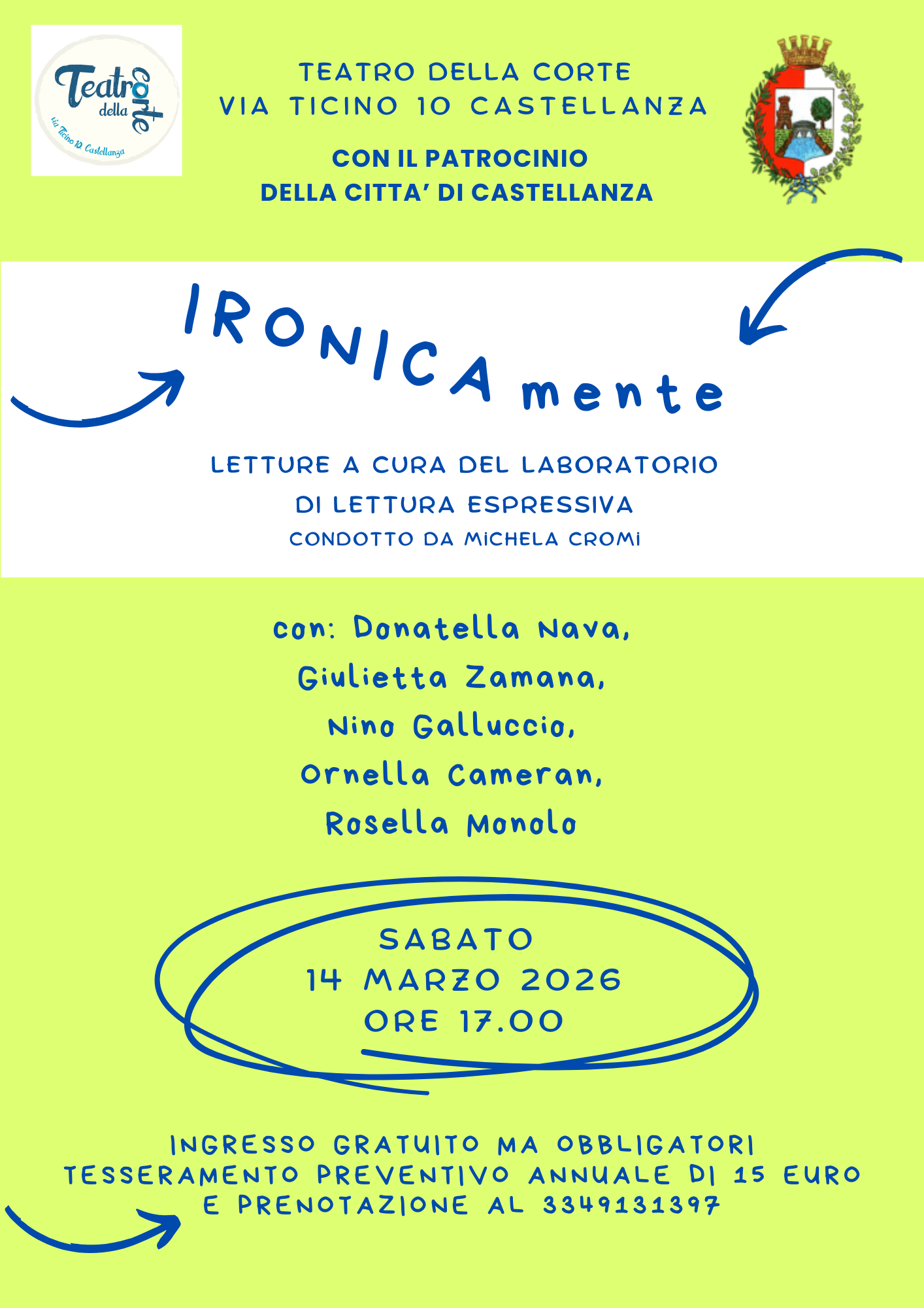 Sabato 14 marzo alle 17 il Teatro della Corte, in via Ticino 10, propone “Ironicamente”, un appuntamento dedicato alla lettura espressiva a cura del laboratorio condotto da Michela Cromi.