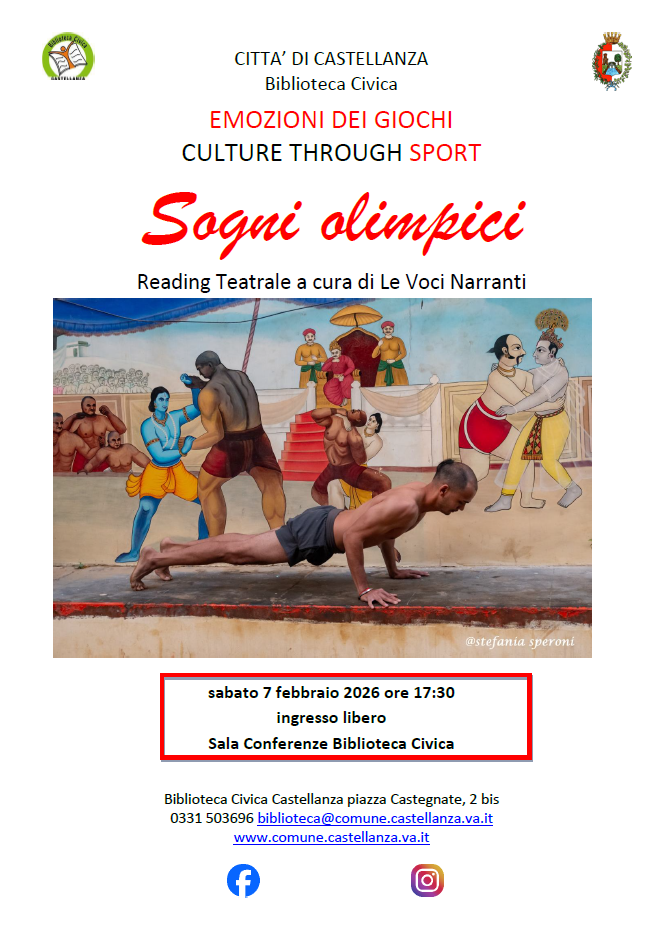 Sabato 7 febbraio 2026 alle ore 17.30 la Sala Conferenze della Biblioteca Civica di Castellanza ospiterà «Sogni olimpici» reading teatrale a cura del gruppo Le Voci Narranti, nell’ambito della mostra "Emozioni dei Giochi – Culture through Sport" (visitabile sino al 21 febbraio negli orari di apertura della Biblioteca).